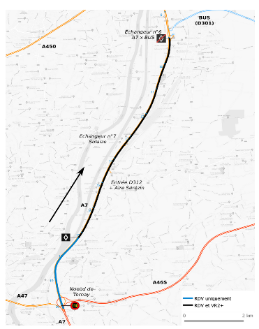 Elle débute au niveau du nœud de Ternay (échangeur A7-A47-A46) pour se terminer au niveau de l’échangeur avec la D301, pour une longueur d’environ 11 kilomètres. La vitesse affichée sur les panneaux de polices variables s’appliquera sur les trois voies de l’autoroute, uniquement dans le sens sud-nord.